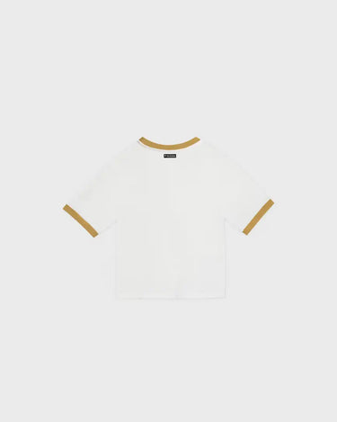 The creamy white base with mustard trims creates a playful contrast, while the bold slogan adds character.