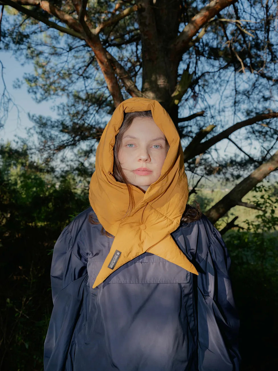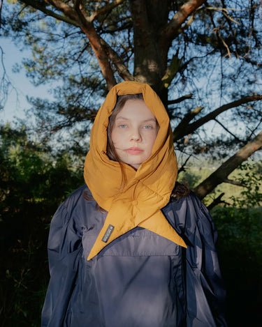 Our capuche (yes, a stylish hood for those chilly days) is as light and fluffy as real down but 100% cruelty-free. Wrap yourself in softness and serenity with our light blue vegan headscarf. This sculptural, softly padded piece offers full winter functionality with a peaceful aesthetic. Lined with down-like vegan insulation, this sky blue scarf protects your head, ears, and neck from cold and wind. The fabric feels gentle on your skin, while the structure keeps it stylish and snug. Whether you're walking through city frost or heading for a cozy café, this cruelty-free winter accessory adds a soft pop of pastel and a lot of warmth.